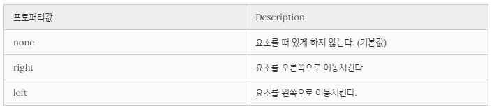 4) 기본 레이아웃 흐름에서 벗어나 요소의 모서리가 페이지의 왼쪽이나 오른쪽으로 이동하는 것